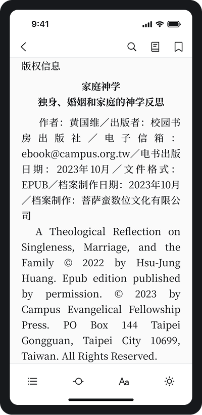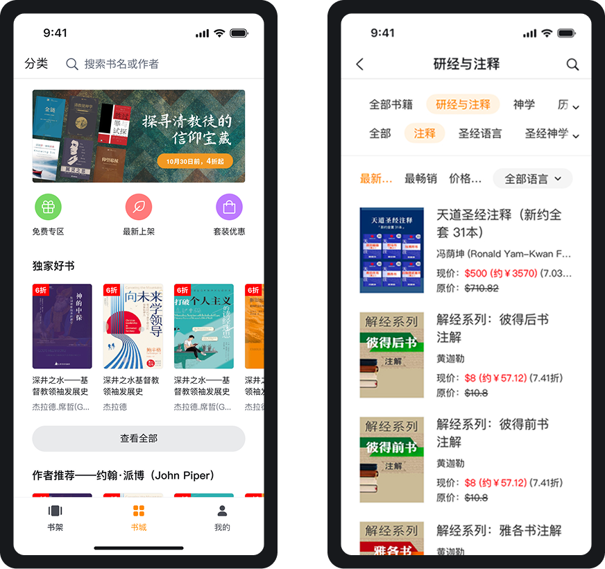 简洁精致的排版、流畅的阅读体验。「微读书城」平台集合了最优质的中文基督教电子书籍。且APP中所有内容皆为正版,已获得出版社及事工机构的授权。